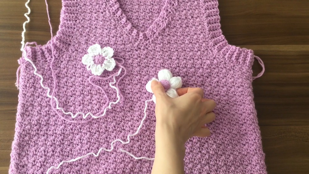 Tip: To make the daisies pop, use a high-contrast yarn for the vest body (like navy blue or forest green). This highlights the white petals and yellow centers, making the floral details the true star of the outfit.
