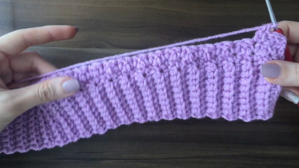 To begin, construct a long ribbed border for the waist by chaining ten and working nine single crochets into the back loops for approximately fifty-five rows.