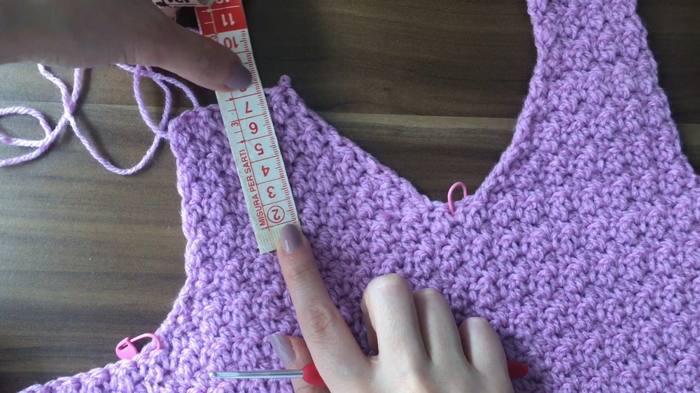 Shape the armholes and V-neckline by incorporating specific decreases, reducing stitches at the edges until the chest reaches about sixteen centimeters in height.