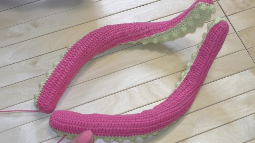 Textured Suction Cups: Crochet rows of 5-loop bobble stitches (puff stitch variation) in a contrasting color (yellow) onto the underside of the tentacles to simulate detailed suction cups.