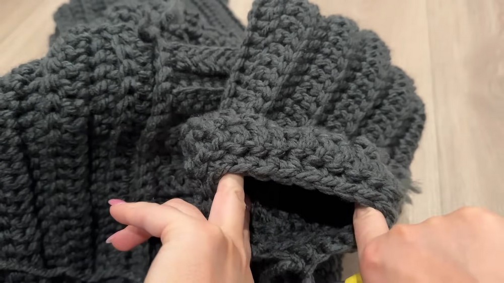 - Fold the hood upward and seam the top edges using single crochet stitches.