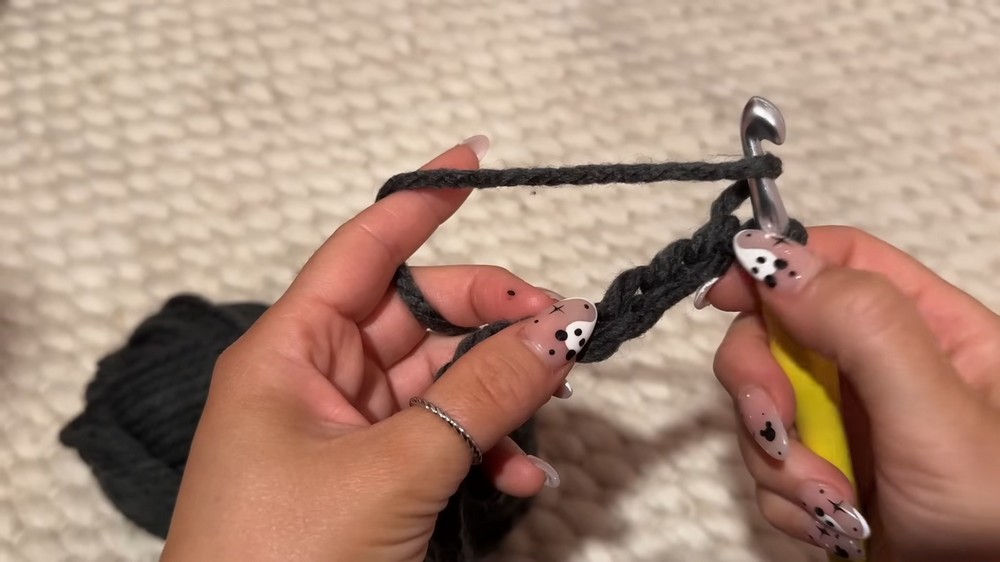 - Start by chaining 34 stitches (or adjust for your desired length; tutor’s version is cropped).