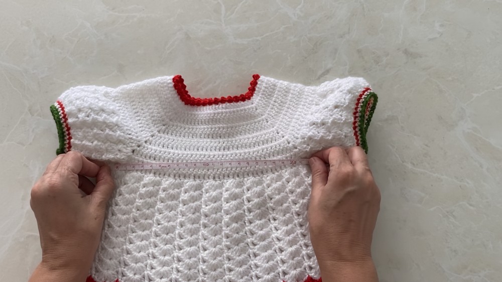 - Once the neckline reaches 9 cm height, prepare to separate the sleeves and start the body.