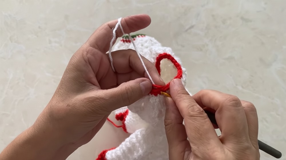 - Work 10 rows of patterns alternating color changes (e.g., adding red or green yarn).