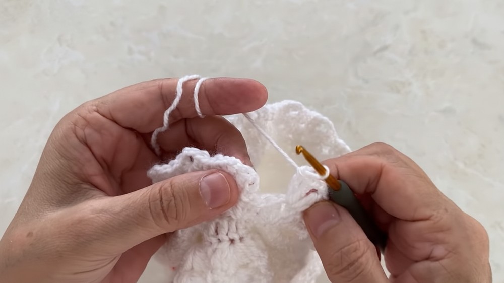 - Attach white yarn at the sleeve base. Begin working patterns with clusters of 2 double crochets, 2 chains, and 2 double crochets.