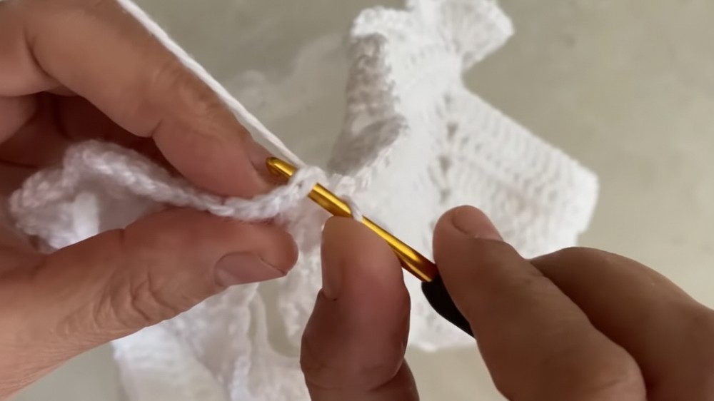 - Continue crocheting rows for the neckline. At each increase point (the chain spaces), work 1 double crochet, 2 chains, and 1 double crochet to expand the collar.
