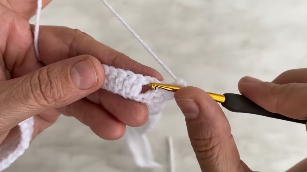 - Begin the pattern row with alternating groups of 3 double crochets, 2 chains, and 3 double crochets, followed by skipping a stitch and creating a single double crochet in the next. Repeat this pattern across the body.