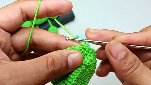 Keep your tension tight to ensure the stuffing remains hidden. If you are using safety eyes instead of beads, remember to insert them through the white and green layers before closing the head at Rnd 16. The tutor suggests that adding a small amount of blush with a pink colored pencil or real makeup under the eyes can add extra cuteness.