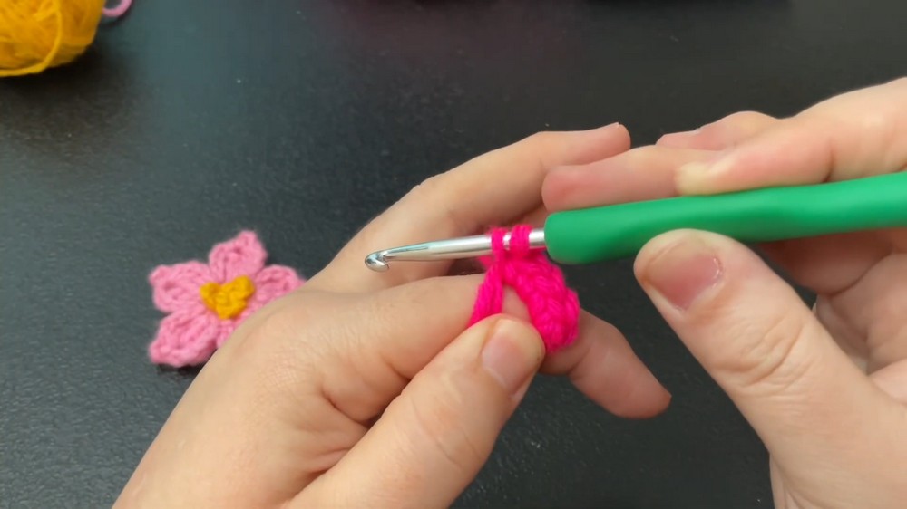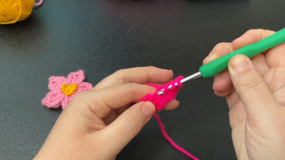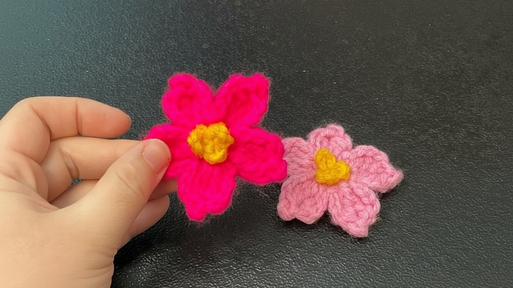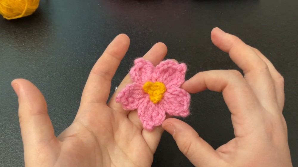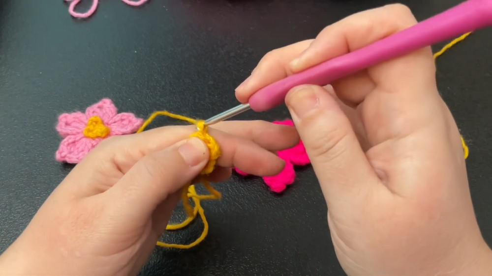 Yarn: 4 mm medium-weight yarn (the tutor uses neon pink for the flower and yellow for the center).