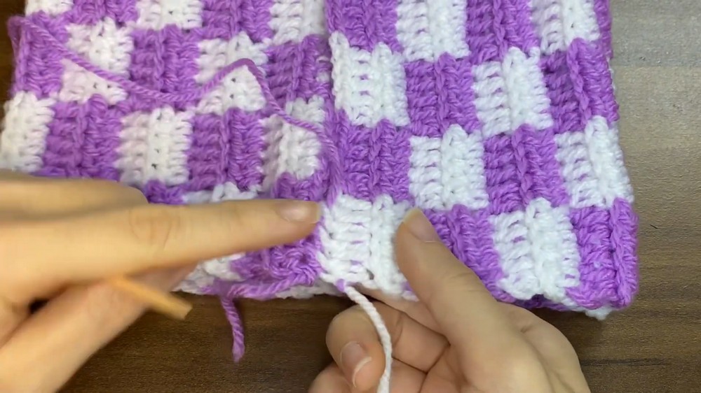 As you continue crocheting downward, keep the color changes consistent to maintain clean squares.