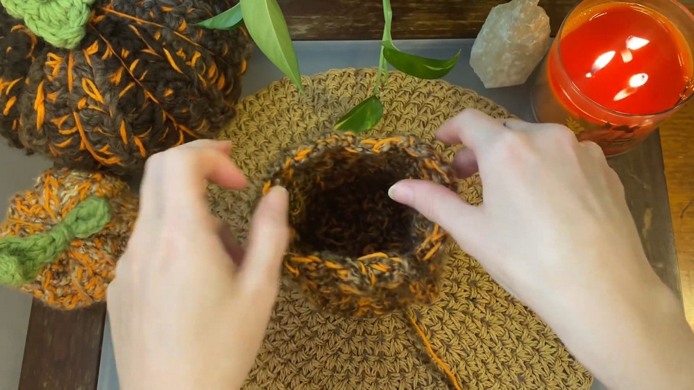 • Crochet rows until the length of the piece is three times the height of the pumpkin.
