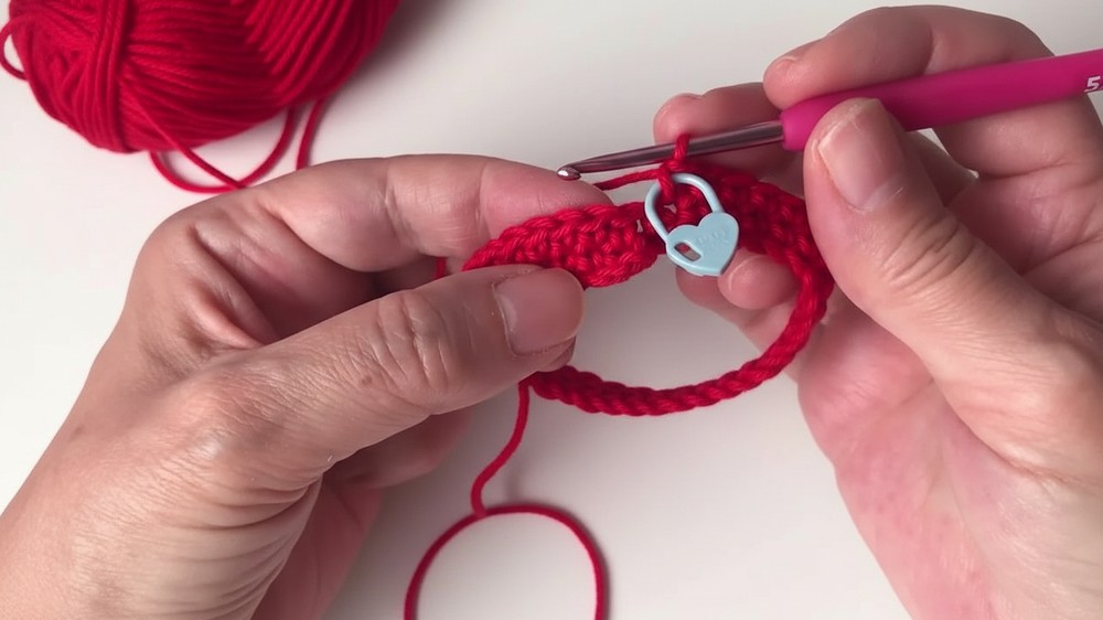 Notions: A stitch marker, and a plastic bread clip for reinforcement (optional).