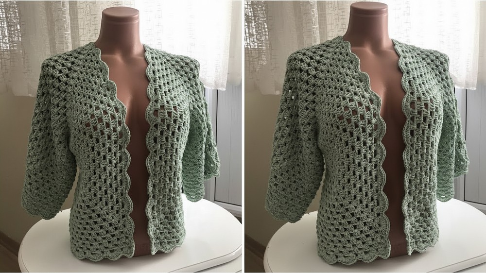 You create a comfortable and stylish hexagon cardigan (hırka). The tutor's final example piece fits a size 38-40, with a width of 48 cm and a length of 54 cm.