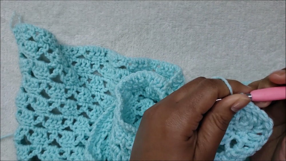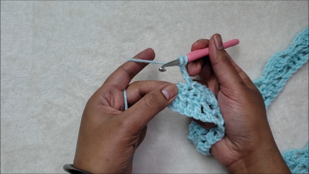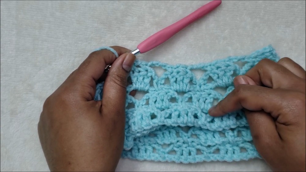 - Repeat this row by alternately chaining and working blocks of SC and DC stitches.