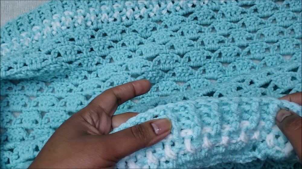 - Continue until the blanket reaches the desired size (in the tutorial, the finished piece was 34 inches by 34 inches).