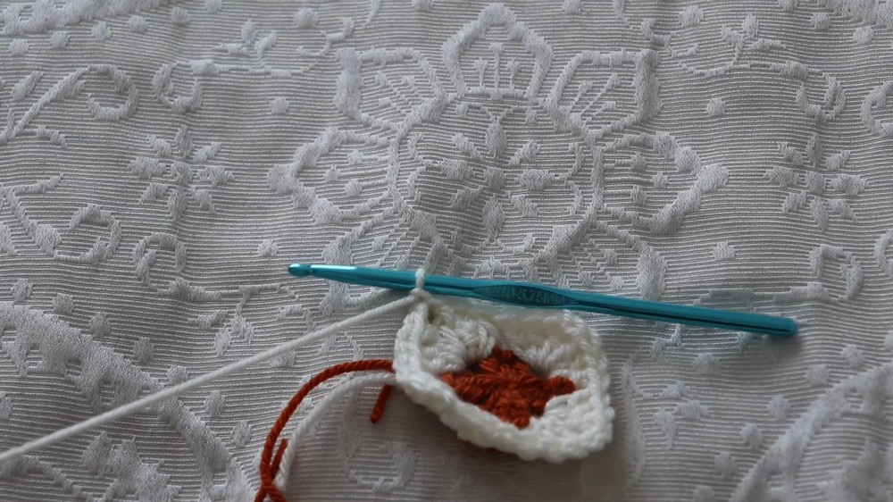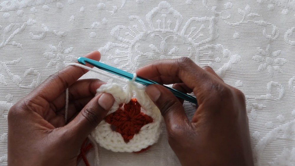 Each round consists of clusters of three double crochets separated by chain spaces, with corners built using the "three-double crochet, chain two, three-double crochet" sequence.