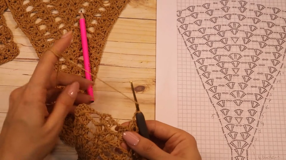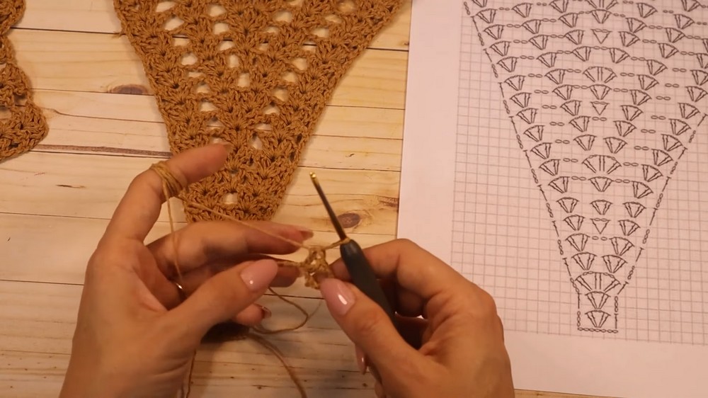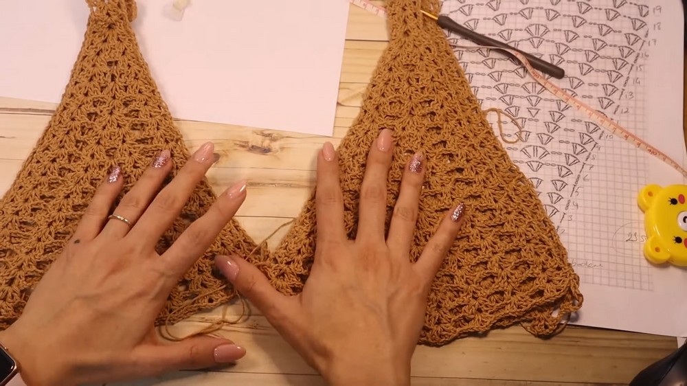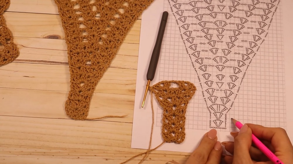 Expansion Method: The chest cup grows by strategically placing multiple V-stitches within the central V-stitch of the previous row, leading to a smooth, triangular expansion.