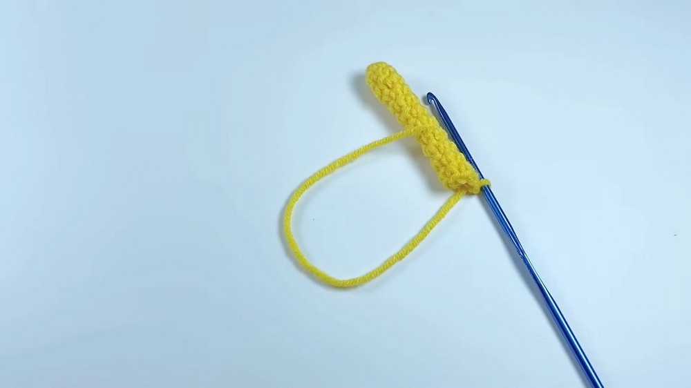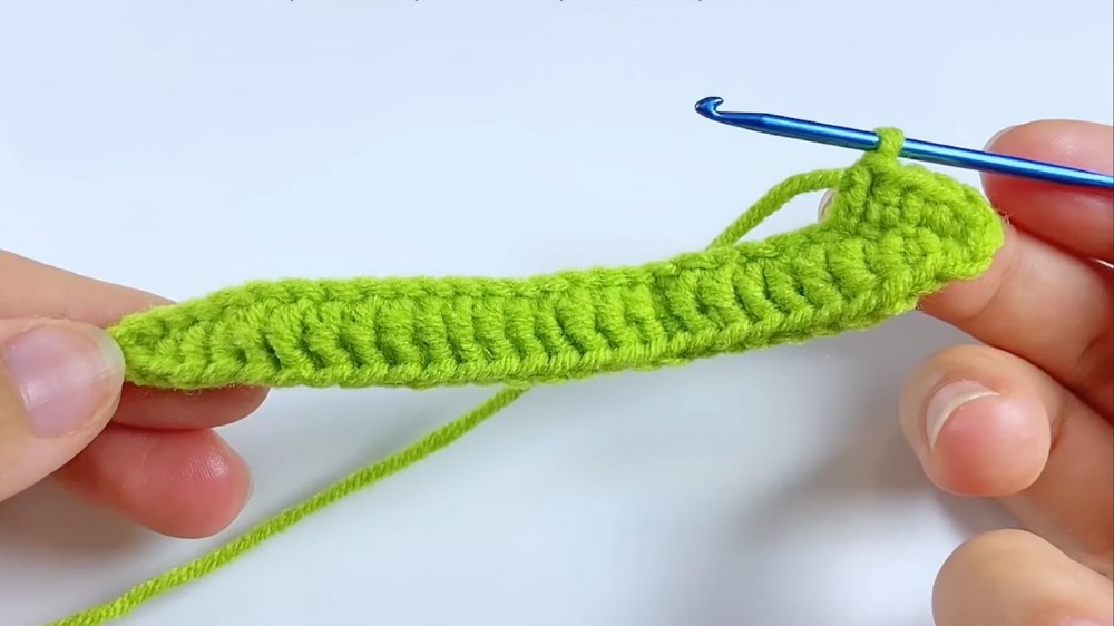 - Use green yarn to create a supportive stem. Chain 28 stitches, then shape one side of the leaf as follows: