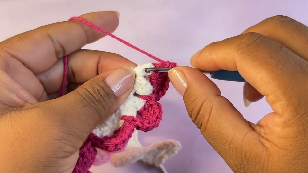 - Turn the fabric again. In each chain-space from the motifs, create a "fan" with four stitches: two DC, chain 2, and two DC. Complete all 17 motifs this way.