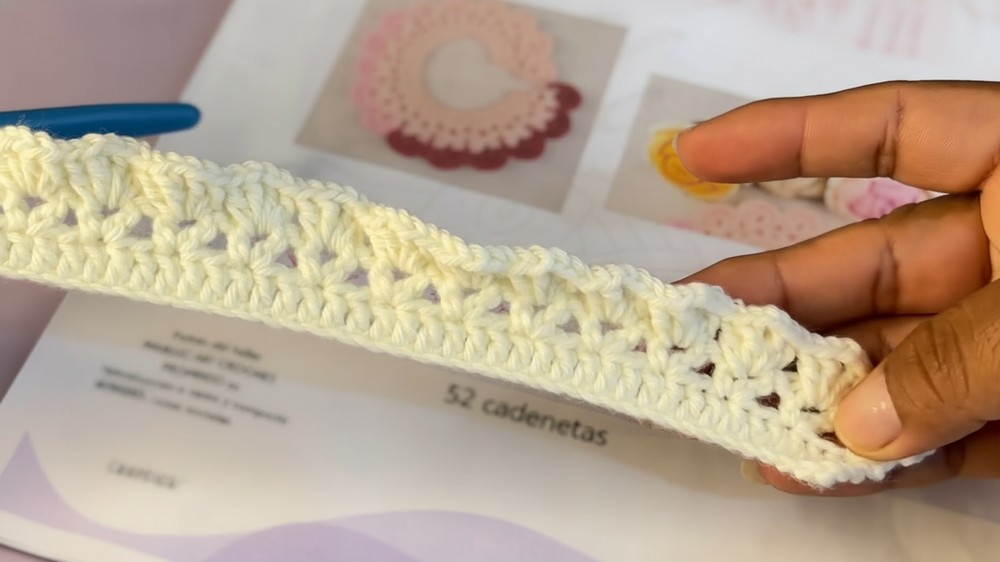 - In every third stitch, crochet a double crochet, chain one, and another double crochet into the same space. Repeat this across to finish with 17 motifs in total.