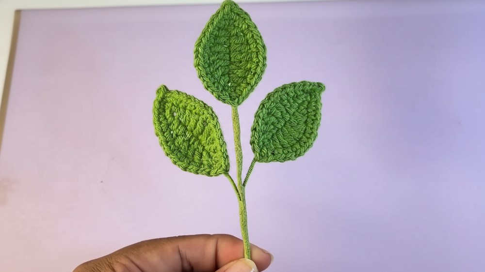 - Insert a 20 cm wire along the leaf’s spine and secure it with yarn using single crochets around the edges.