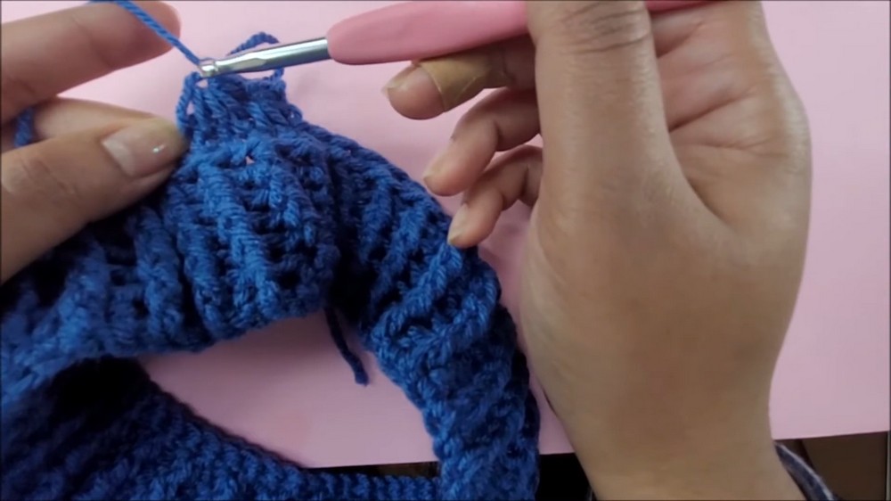 - For this row, work single crochet 2 together by combining two back-loop stitches into one. Repeat around the row.