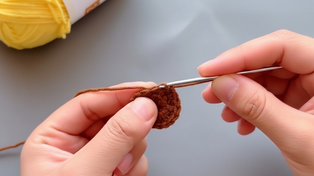 To create this blossom, start by making a magic ring and working six single crochets for the brown center, followed by a round of increases to reach 12 stitches.