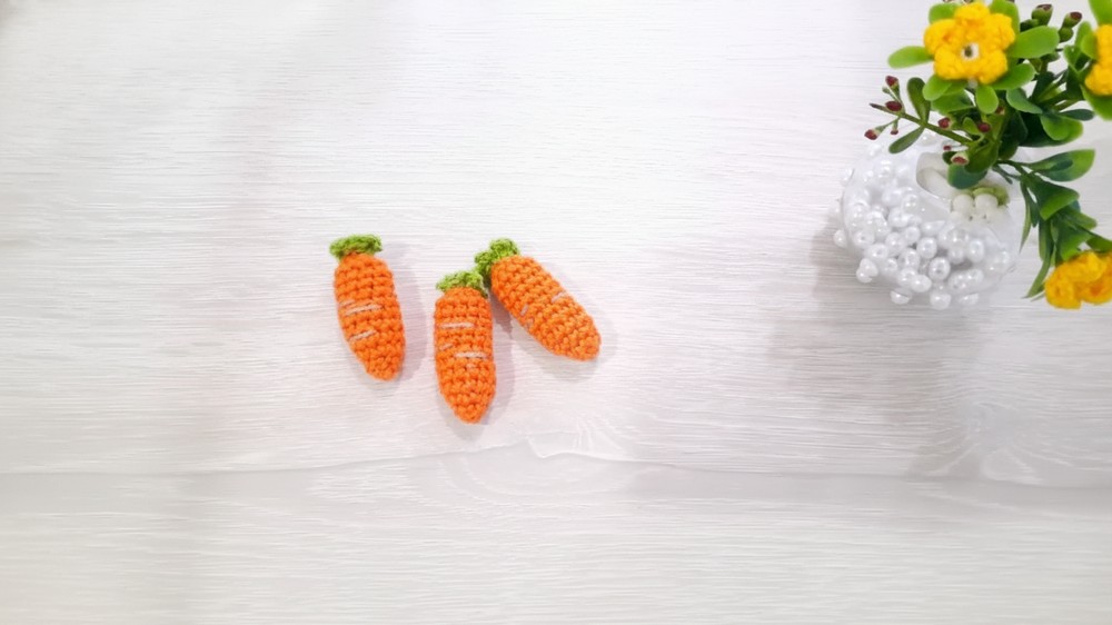 Textural Detail: You add simple, random horizontal lines using light brown yarn to mimic the root texture found on a real carrot.