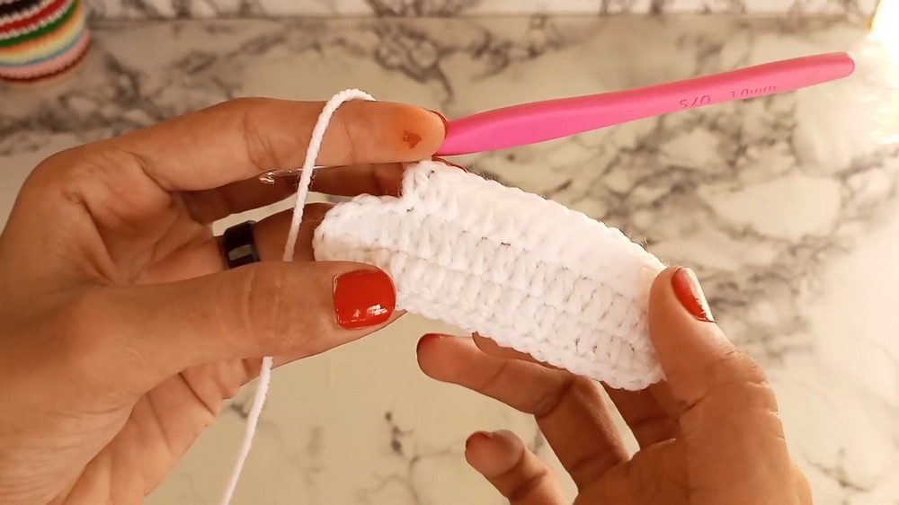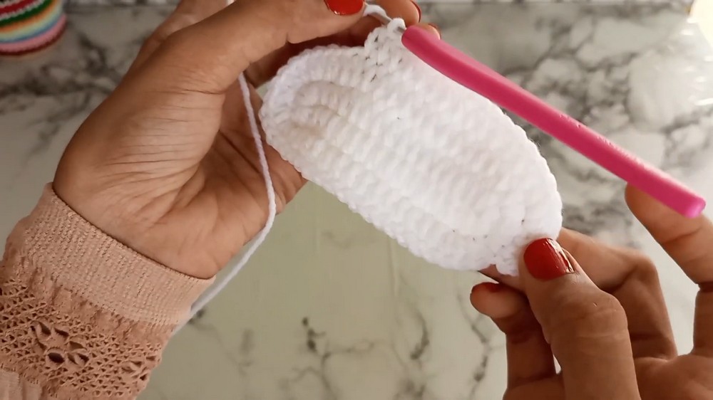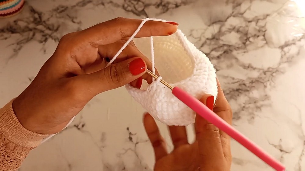 The body of the bootie is built upward using two rounds of double crochets followed by a series of decreases at the front to form the rounded toe shape.