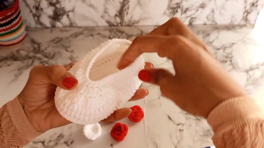 A specialized feature of this pattern is the addition of a thin elastic band stitched into the ankle rim, which ensures the footwear stays securely on the baby's foot without slipping.