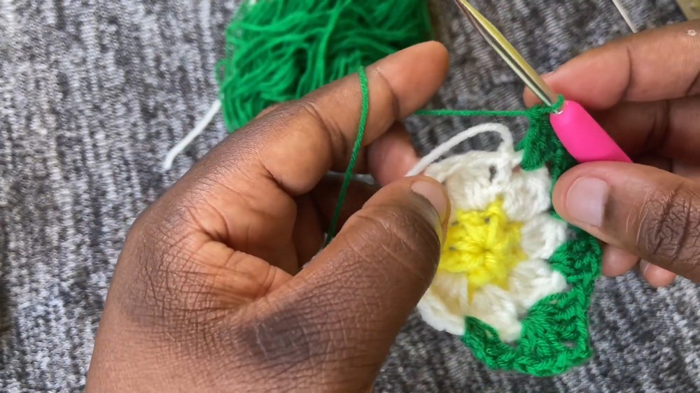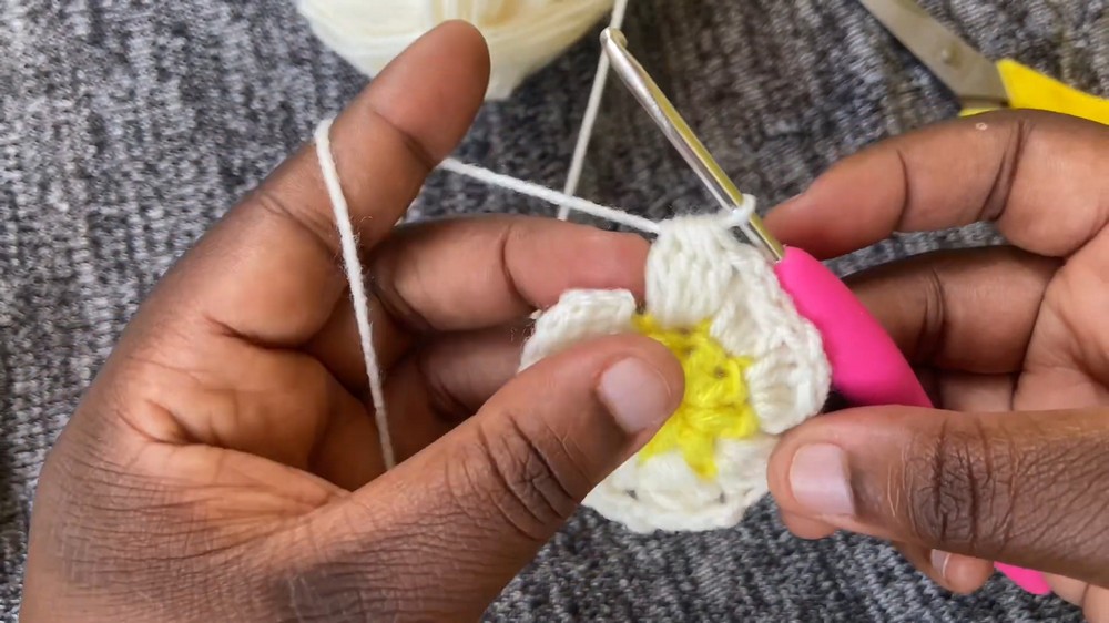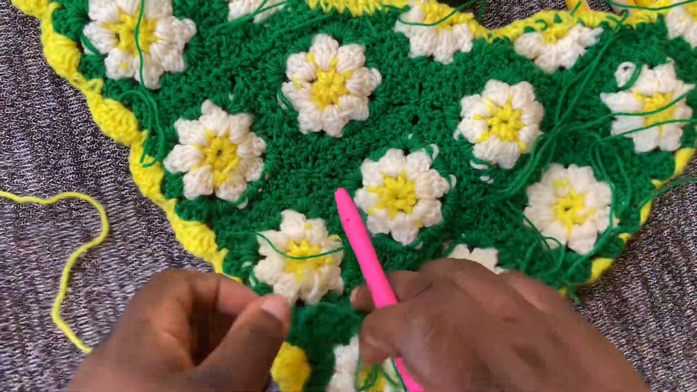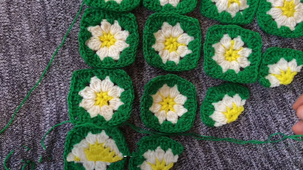 To begin this creative journey, you first crochet ten full floral squares and five half-squares by working double crochet stitches into a small chain ring.