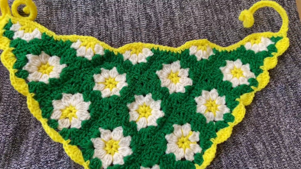 The video introduces a decorative and functional crochet bandana composed of 10 full floral granny squares and 5 half-floral granny squares. The design uses a modular approach, where individual pieces are crocheted separately and then joined to form the triangular shape of the bandana.