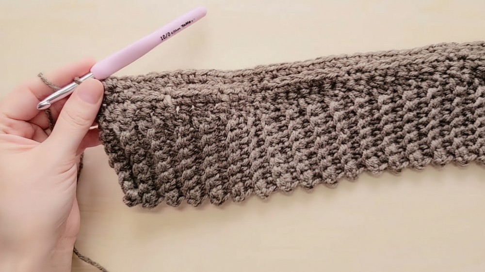 Start with a foundation chain to match your preferred width. Build the main fabric using double crochet and shell stitches in rows.