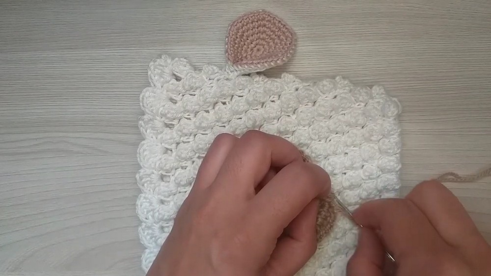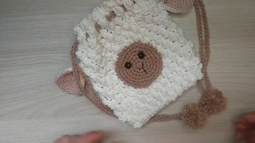 The key feature of this design is the use of the Popcorn Stitch (Ponto Pipoca) throughout the main body of the pouch, which mimics the texture of sheep's wool. The pouch base starts as a flat oval, worked in the round, before transitioning to a tubular shape using this textured stitch. The design also includes separate, two-toned ears, a crocheted face, and a scalloped edge for the opening.