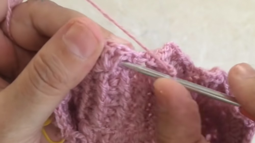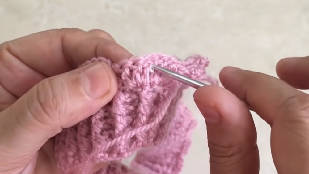 - Crochet 5 rows of 1 plain 1 purl stitch around the circle, alternating between double crochets taken from the front and back gaps.