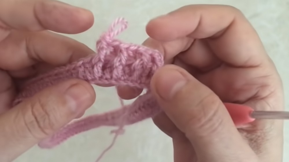 - Crochet with 7 double crochets initially, using 1 plain 1 purl stitches for the strap length.