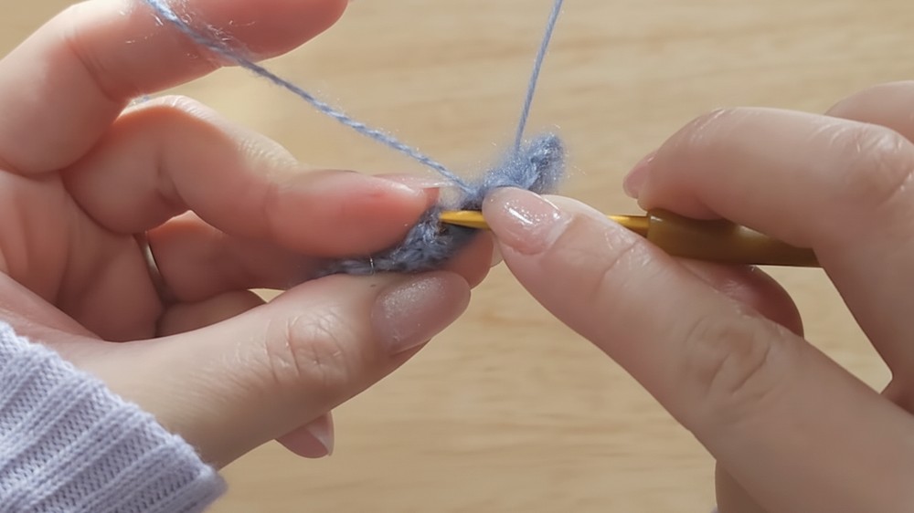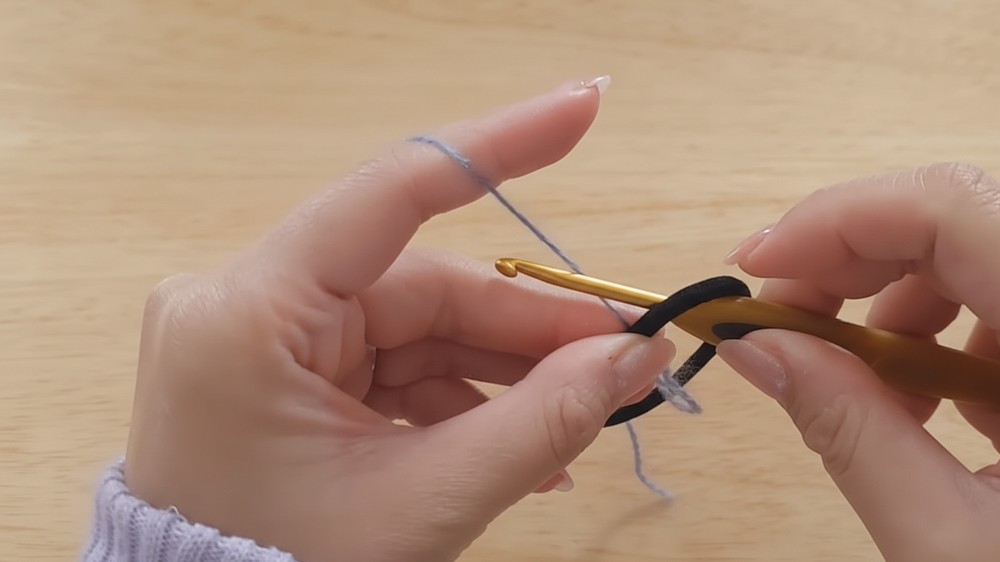The pattern begins by working single crochets directly over a hair elastic until it is completely hidden.