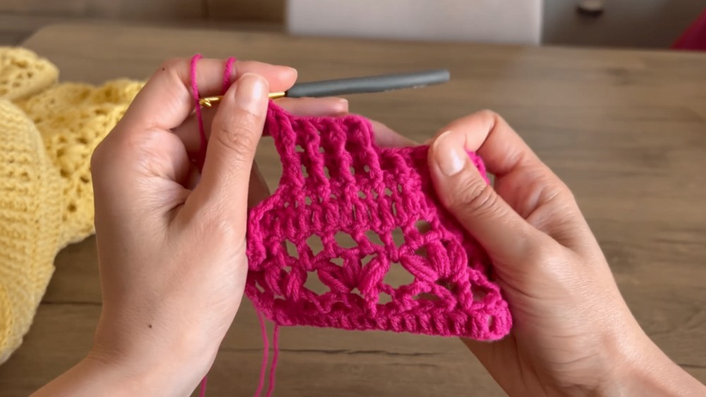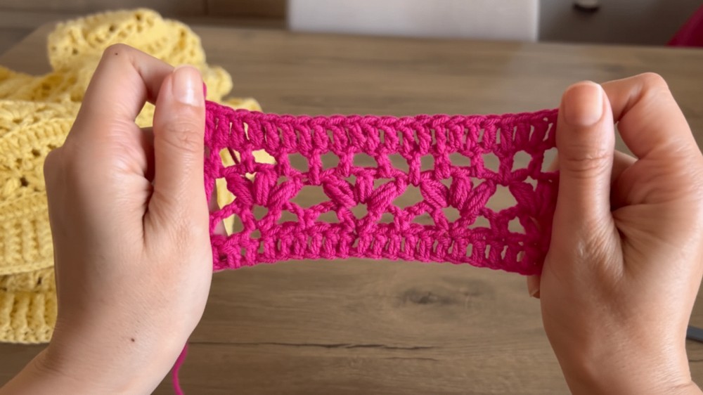 - Continue this pattern, alternating between a regular double crochet row and a V-stitch row.