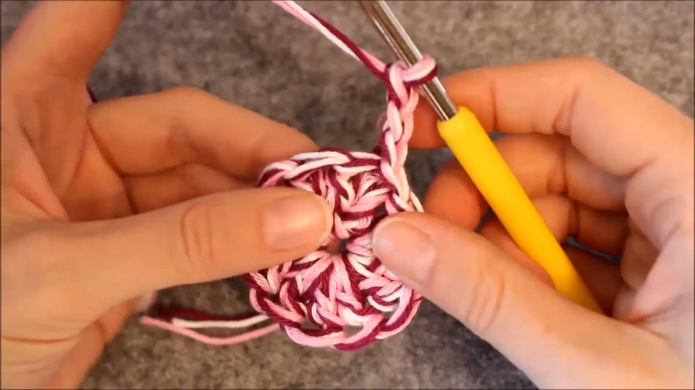 - Start the second round by chaining 3 stitches, which counts as the first double crochet.