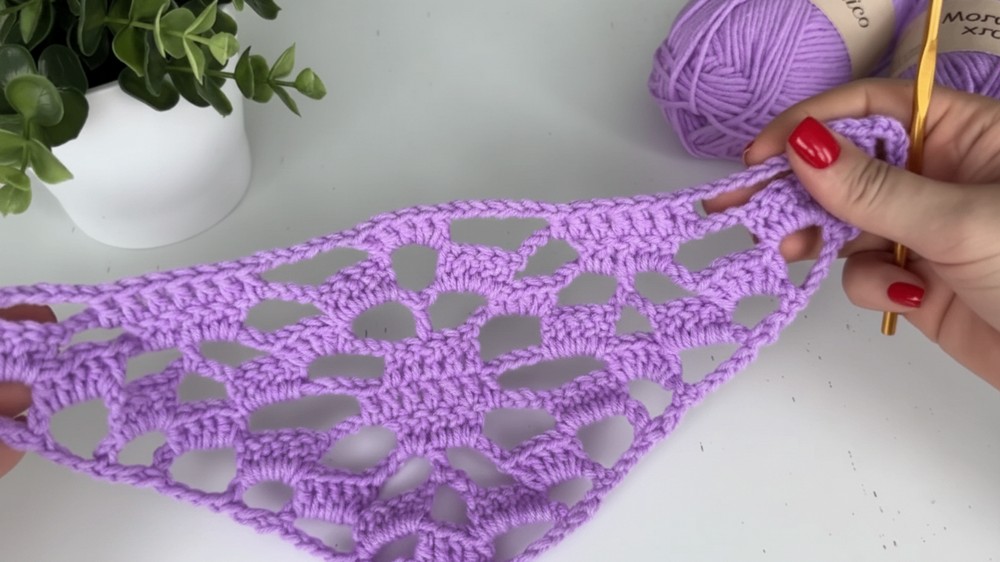 You have successfully crocheted a beautiful, oversized triangular shawl using a simple yet effective expanding rhombus pattern. The finished piece is soft, airy, and has a rich, textured look, ready to serve as a cozy, wearable accessory.