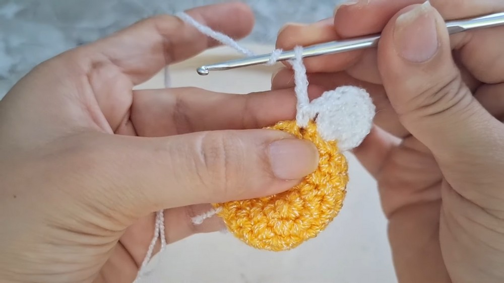 Join the white yarn by inserting the hook through the stitches of both layers simultaneously.
