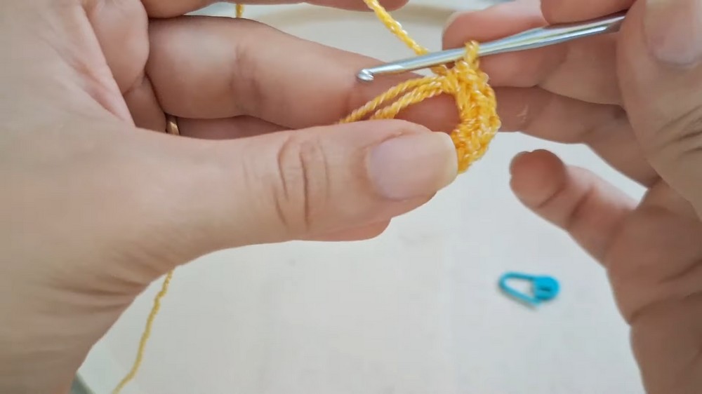 Several double crochet stitches are worked into the ring to create a solid base. After closing the center, the yarn color is changed for the petals.