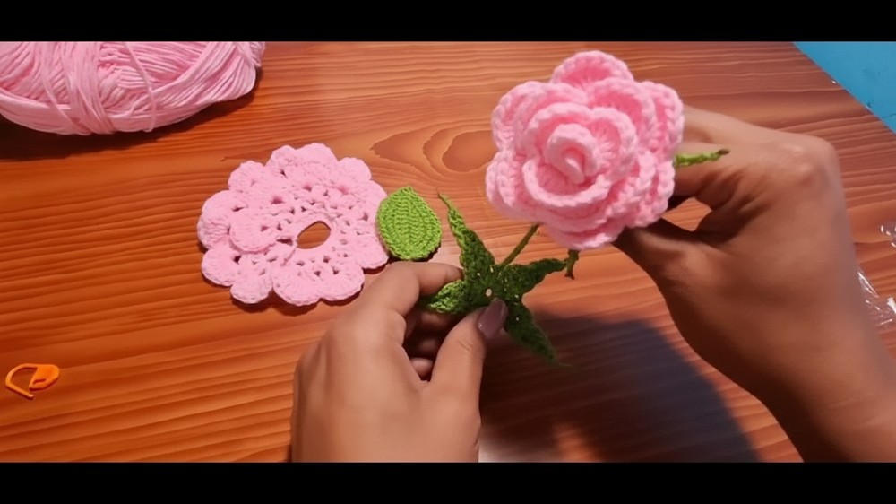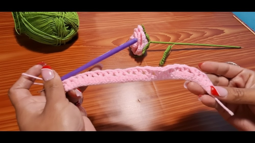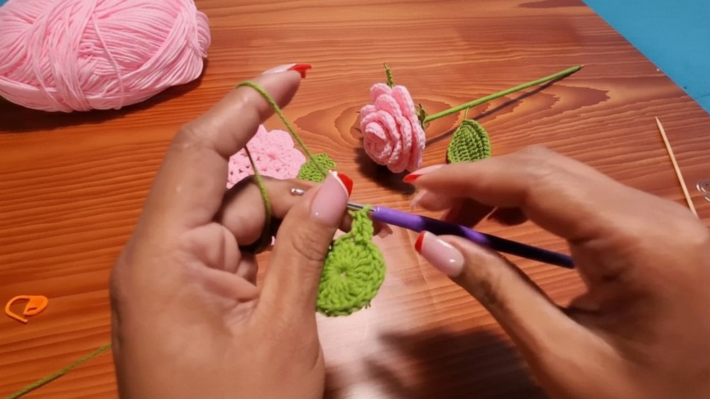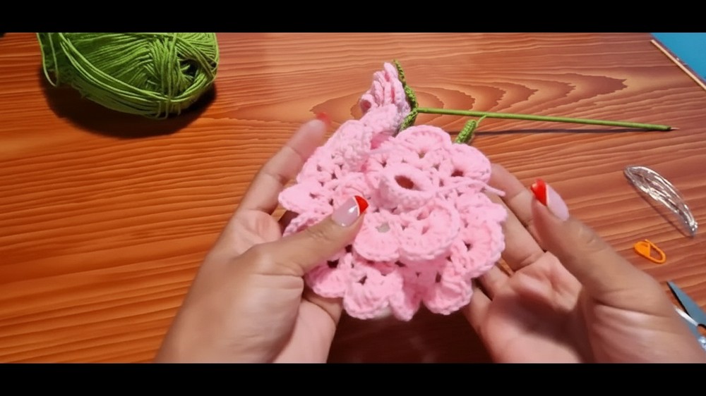 Once the strip reaches the desired length, it is rolled tightly from one end to shape the rose bloom. The base is then secured using a yarn tail, and loose ends are neatly woven in to keep the flower firm.